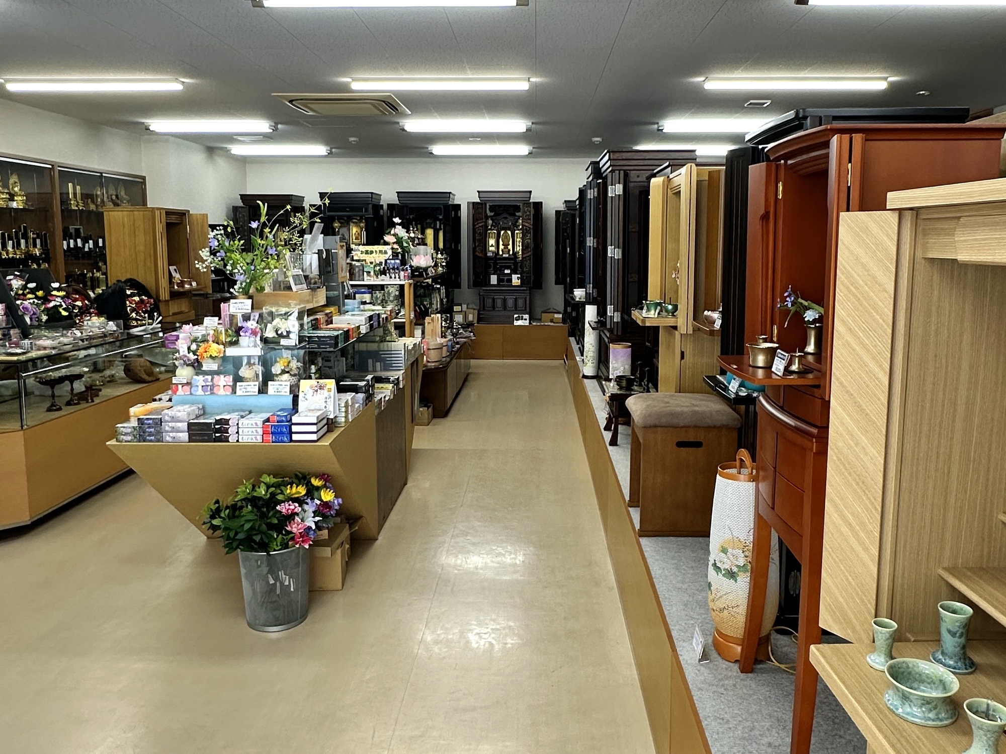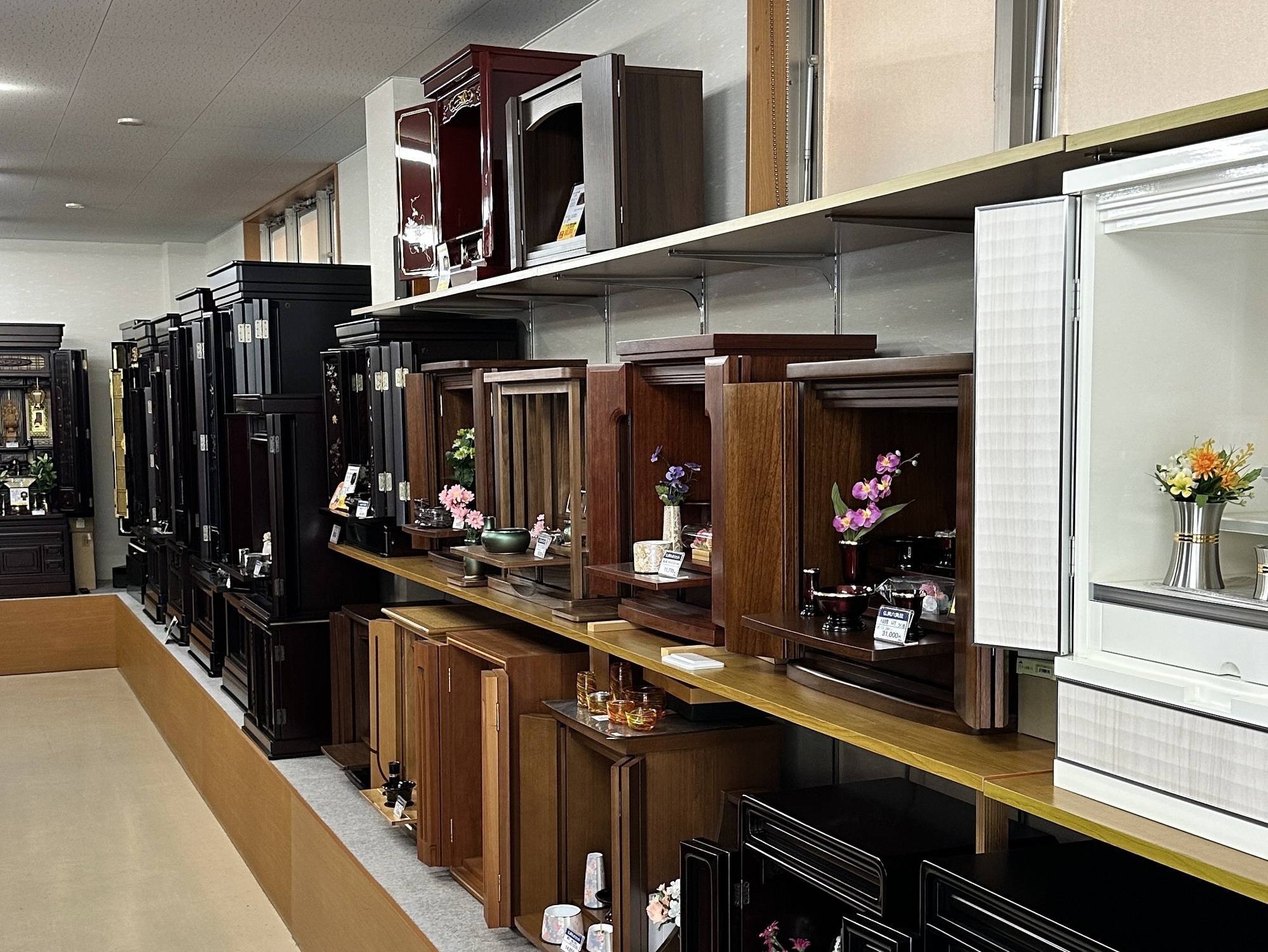 店内には、伝統的なお仏壇から、現代のライフスタイルに合わせたモダン仏壇、コンパクトな上置仏壇まで、約80本を常時展示。お位牌も約100本と豊富に取り揃えております。